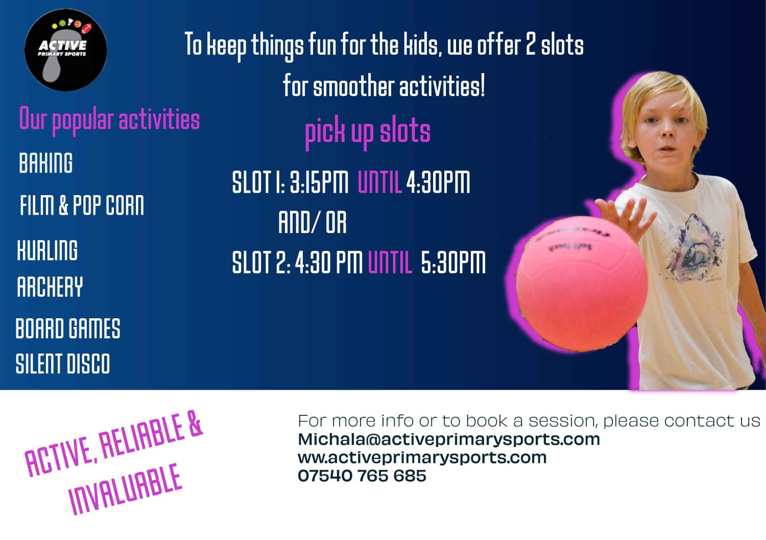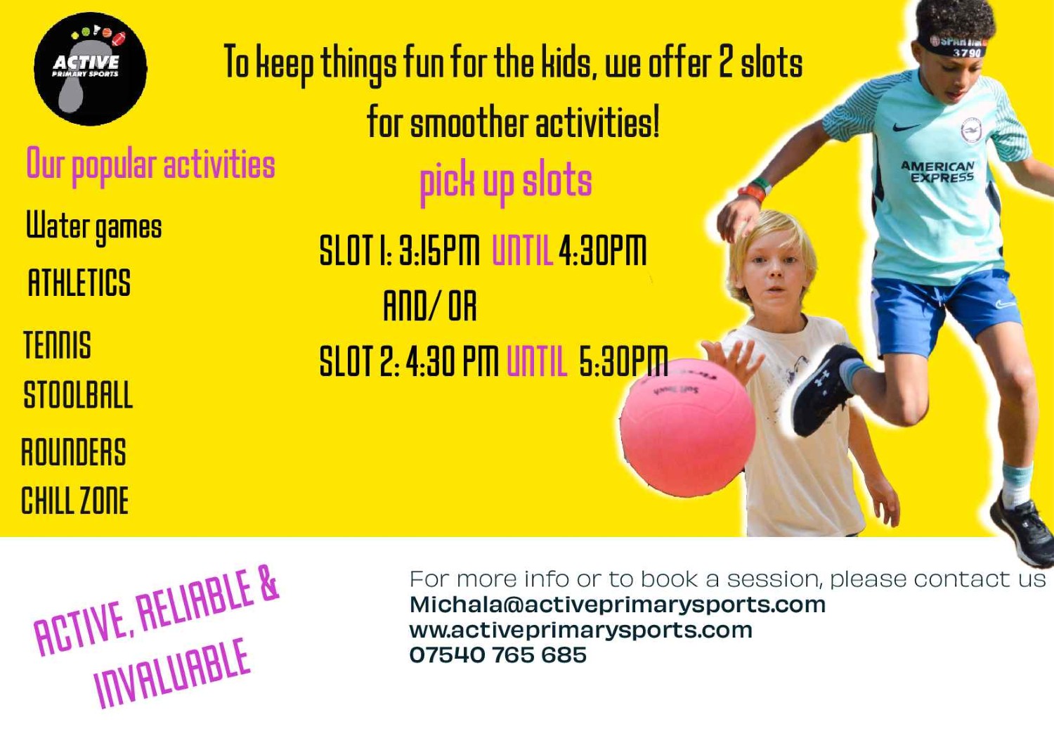 All enquiries and bookings via email to: Michala@activeprimarysports.com